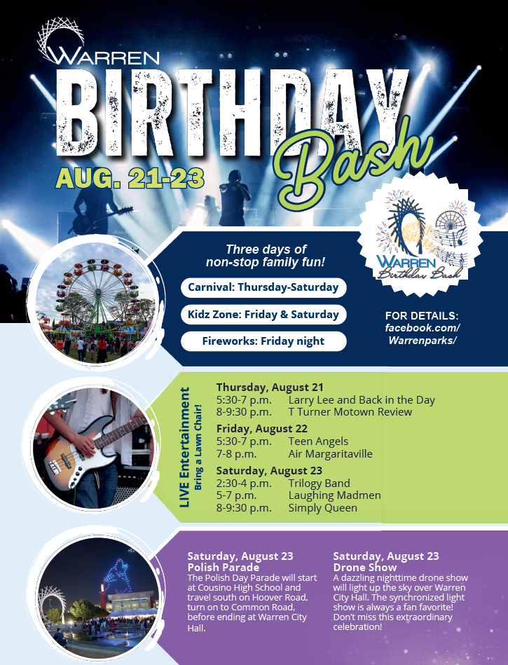 The City of Warren will be holding their Birthday Bash the weekend of August 21-23. These three days of family fun includes carnival rides, live music, local food trucks, a firework show, Polish Day Parade, drone show, and a kidz zone. This event will be held at 1 City Sqaure. To find the itinerary for this event please click here.